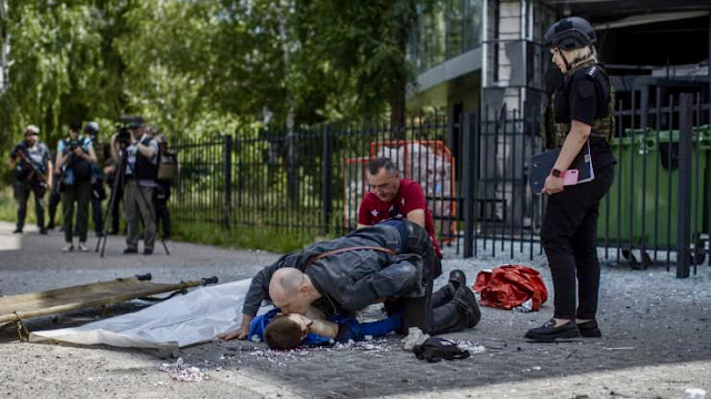 ウクライナ東部のハルキフで7月20日に、13歳の少年がモスク近くで、バスを待っていたバス停に、ロシア軍のミサイル攻撃が炸裂して死亡したと地元ハリキウ当局が発表した。通勤者らがバスを降りるときに、ミサイル砲弾がバス停に着撃して炸裂した。近くのモスクはひどく損傷していた。13歳の息子の父親は、破壊されたバス停の近くの路上に横たわり、赤いホイルシートに覆われた死体の息子の手を握ってひざまずいた。父親は、片手に小さな聖書を持ち、呆然と見つめて祈りの言葉を約2時間も唱えていた。父親は少年の露出した胸に手を当てていた。その後、葬儀作業員が死体袋のチャックを閉めて息子の死体を運び出すのを、立ったまま見届けてから、十字架のお祈りをした。ハリコフ州知事は、7月22日水曜日にハリコフで3人(10代の若者、男性、女性)が死亡した。地元のダンス教室に通っていた13歳の息子は死亡して、15歳の姉(Ksenia)は負傷した。ロシア軍のミサイルやロケット攻撃はウクライナの都市や町を荒廃させて、意図的に民間人も標的にした。地元検察庁は、ロケット弾はウラガン多連装ロケットランチャーから発射したと公表した。