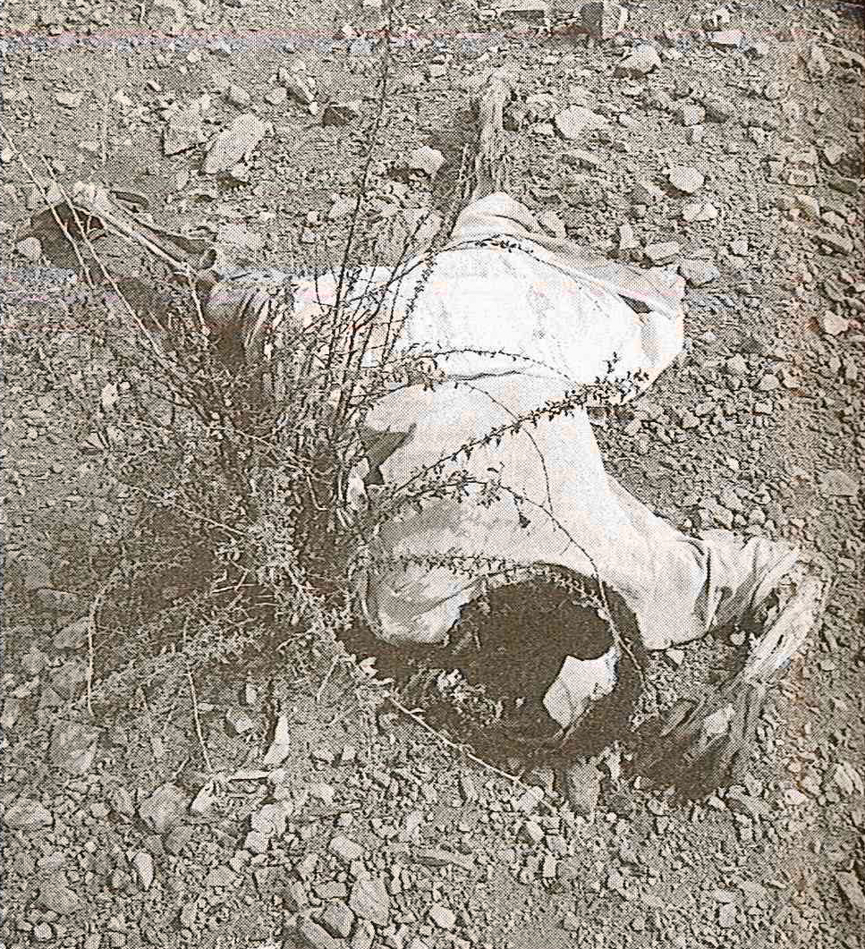 スーダンのダルフール紛争にて、アドワ村の郊外でアラブ系民兵が、大量虐殺した非アラブ系黒人の死体である。死体の付近の50ヤード平方の荒野に、人骨が満杯で散在した。